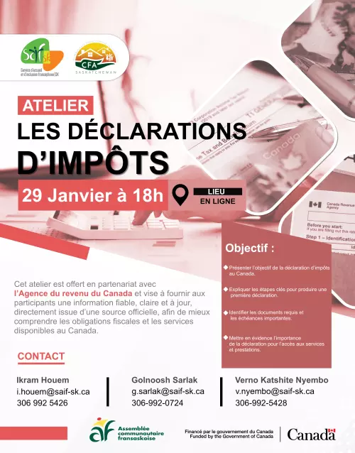 The Saskatchewan Francophone Welcoming and Inclusion Service (SAIF-SK) offers you, in collaboration with the Canada Revenue Agency (CRA), a workshop on: Tax declarations.